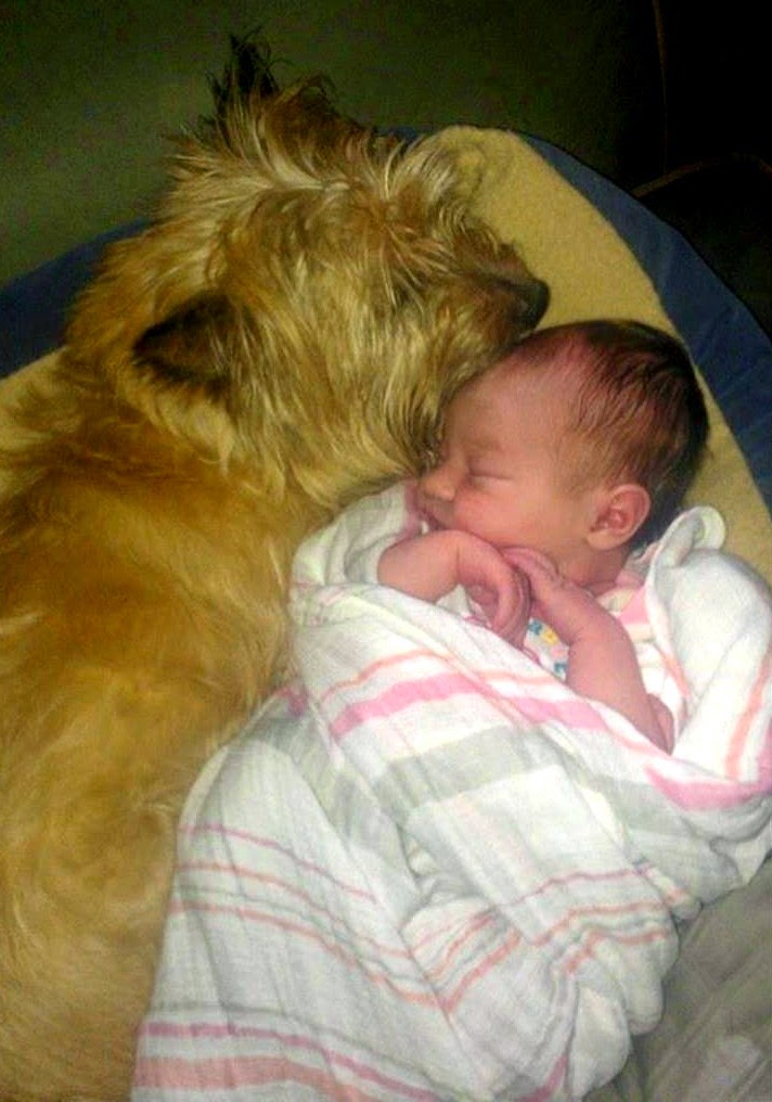 I told him to buy a large baby doll and to wrap it up in a blanket and carry it around, rock it at night, and put it in the swing and crib various times during the day/evening. I told him to let the Cairns sniff and lay next to the pretend baby, but to teach them not to step on the baby or to yank or pull the blanket.